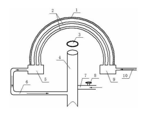 結構標注:1、窯頭;2、通風管道;3、窯口;4、混合管道;5、熱風風箱;6、熱風管道;7、燃氣管道;8、旋緊閥門;9、冷風風箱。